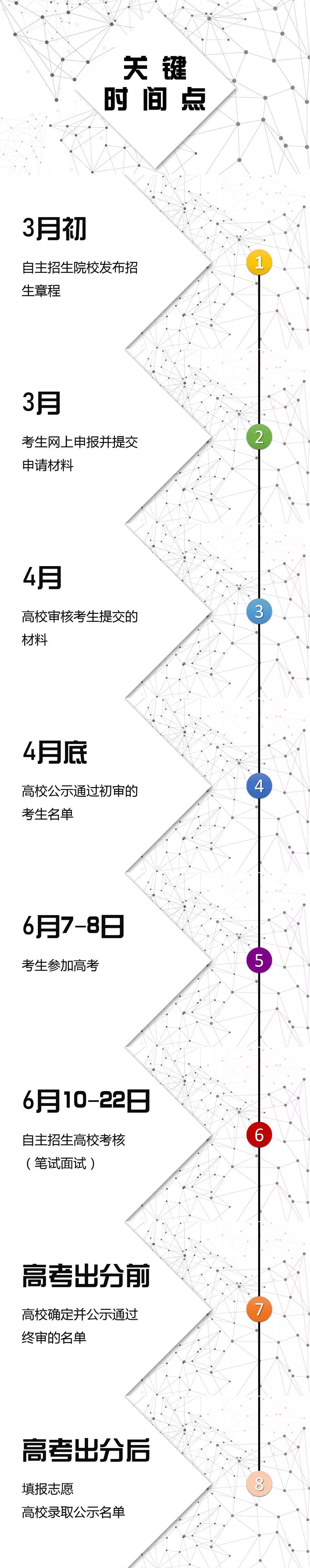 各高校一般在3月份集中发布自主招生简章,明确当年自主招生报名、招生计划及考试等相关事宜。招生简章发布后,考生统一在阳光高考平台报名。