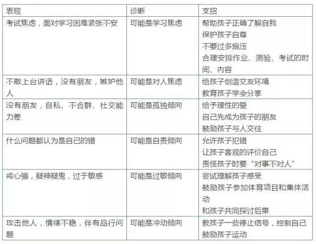 很多这样的孩子,原来学习认真、成绩比较好,逐渐变为不再认真、对学习马虎了事,整日精神萎靡不振,家长们仅仅以为是“孩子学坏了”,埋怨、指责,甚至觉得“棍棒底下出孝子”,但都不管用。这其实可能是孩子心理发出的求救信号,就像感冒前浑身发冷、嗓子难受一样。精神疾病的早期症状可能很轻,如果不加理会,很可能会发展到严重的精神症状,甚至出现“精神分裂”,那么,我们家长该如何评判自己的孩子心理是否足够健康呢? 看看心理医生给出的孩子症状自查表吧!