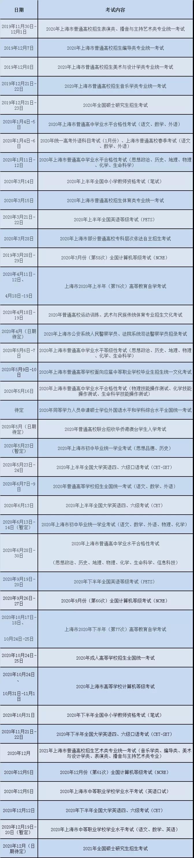 上海市教育考试院公布了2020年上海市教育考试院各类考试信息一览表
