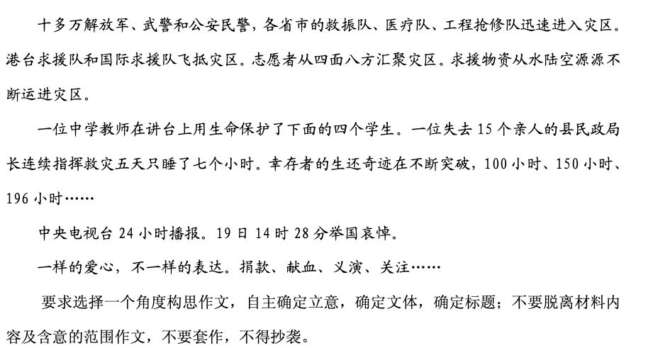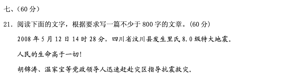 2008年高考之前最大的事莫过于“汶川地震”,尽管5月12日距离高考只有不到一个月时间,当年的高考语文全国1卷还是直接用了60分作文大题来直面这个重大事件: