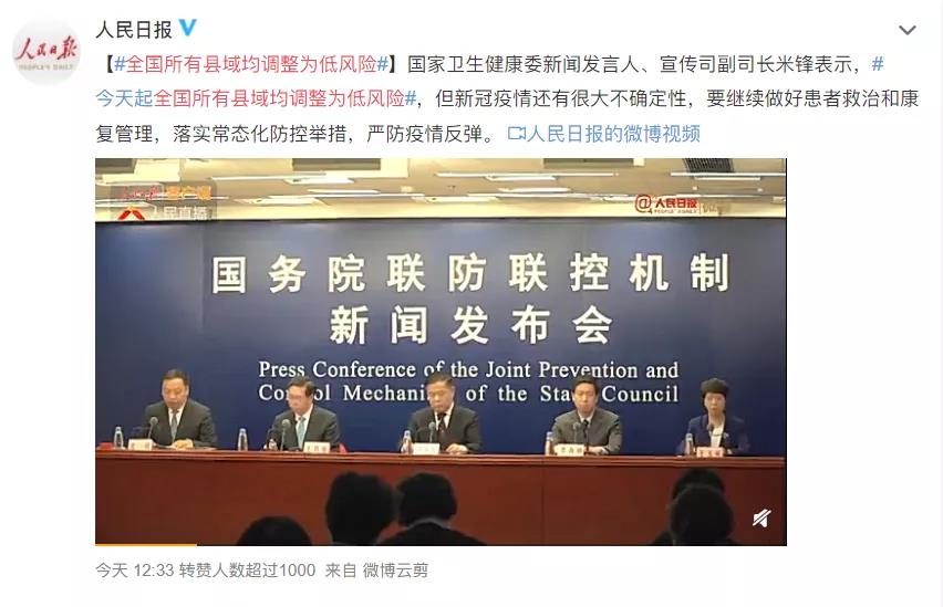 同一天,国家卫健委:今天起,全国所有县域均调整为低风险。