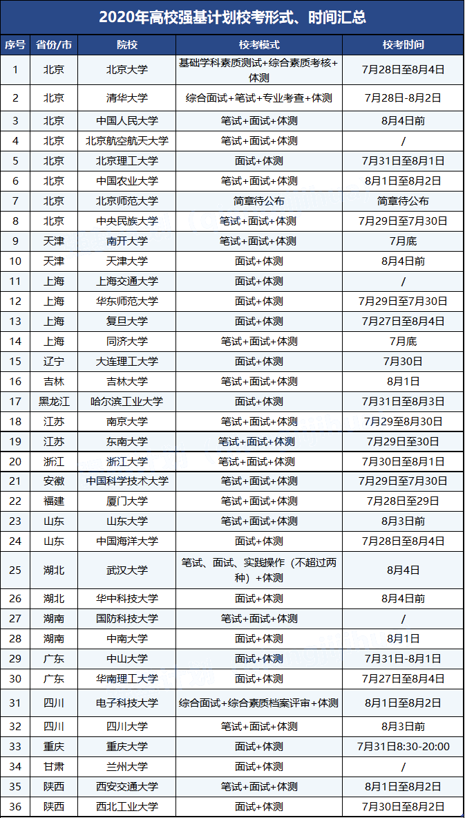 2020强基计划笔试、面试时间由各高校决定,例如同济大学招生简章原文:“我校将于7月底(具体时间另行公布)对入围考生进行考核(含笔试、面试)和体育测试。”