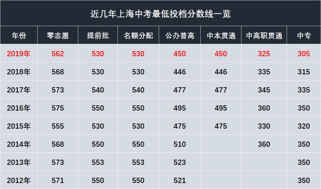 2012-2019年上海中考最低投档分数线: