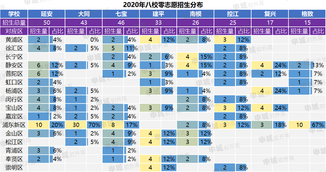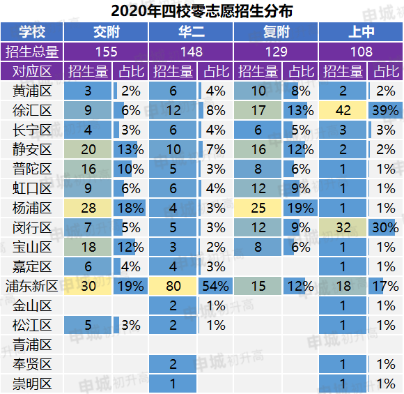 大致上来讲各高中零志愿的招生基本向本区倾斜,或者浦东,静安等质量高的区,今天把这些比例全部列出来排了一下,你们也可以看看,哪些区还是他们比较偏爱的,作为孩子是否跨区的参考指标。